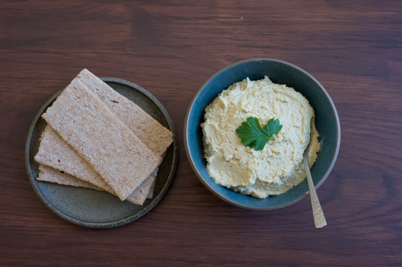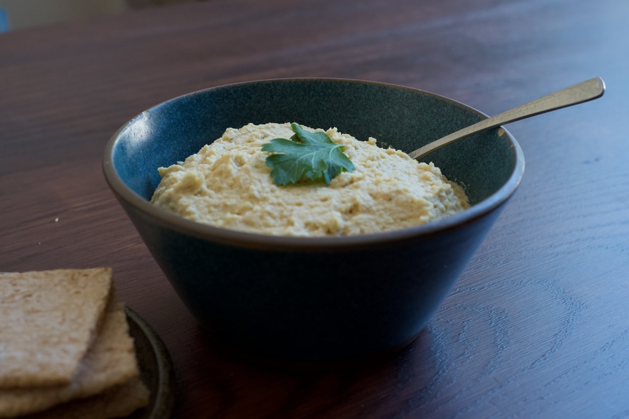 乾燥したひよこ豆200gまたはひよこ豆の水煮400g、すりおろしたにんにく1かけ、タヒニまたは煉ごま大さじ3、レモン汁大さじ2、オリーブオイル大さじ3、塩少々。